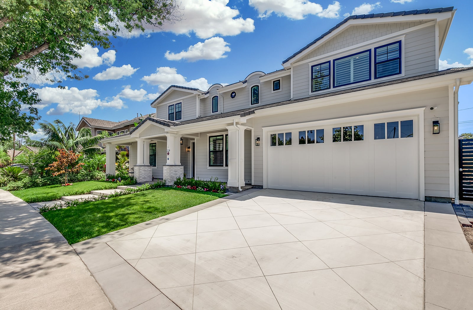 The premier neighborhood of Rossmoor is the setting for this completely new two-story custom residence. The angled site allowed us to design an expansive front elevation that gives a unique air of stateliness to this home. Designed in the popular modern farmhouse style, we used design elements and materials including bow-top gables, framed columns, siding, and brick to help provide warmth and craftsmanship to the home.