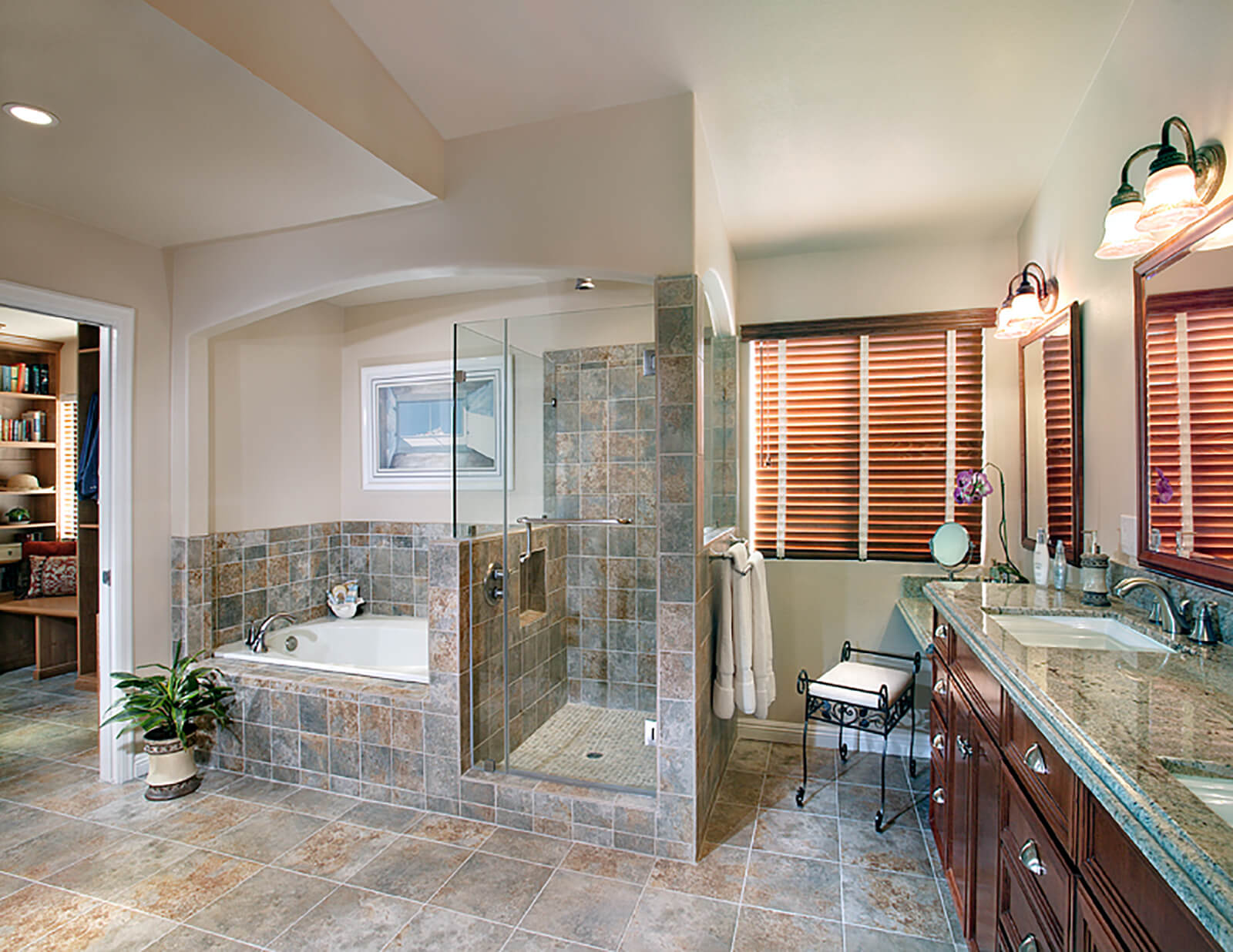 This home had vaulted ceilings throughout, including in the master bath. The client wanted a more intimate feeling while bathing, so we dropped the ceiling and created a smaller-scale space within the larger room.