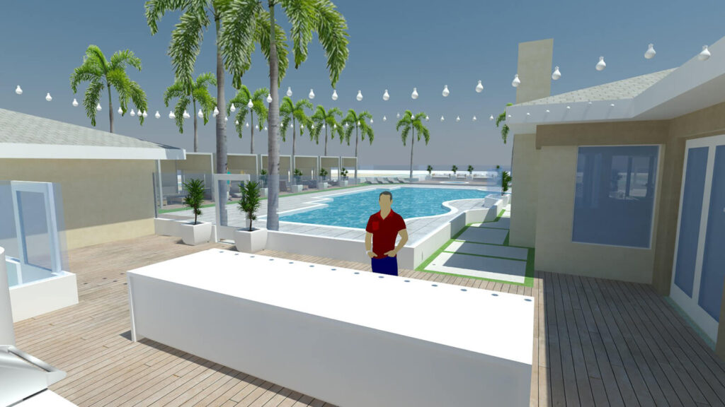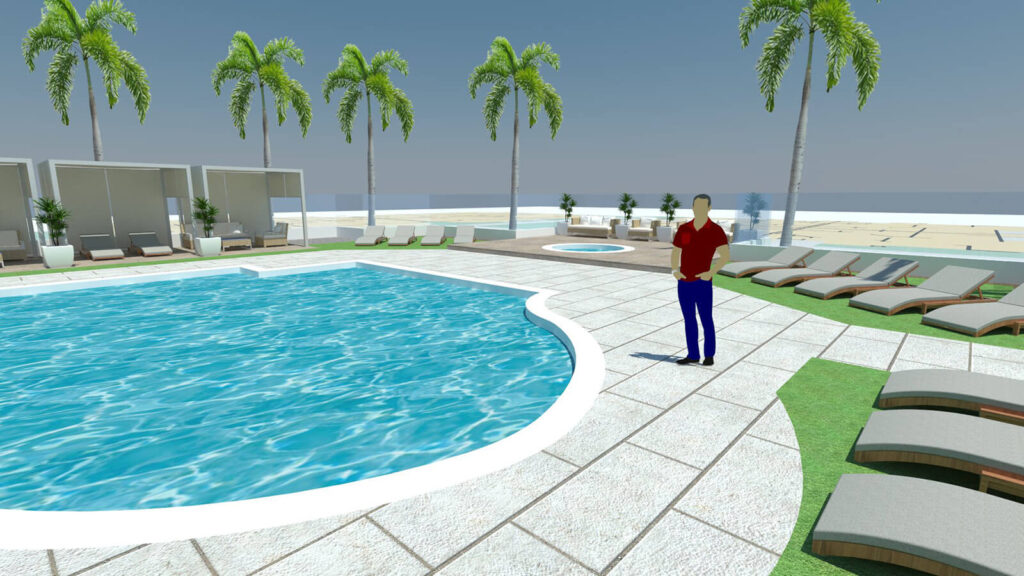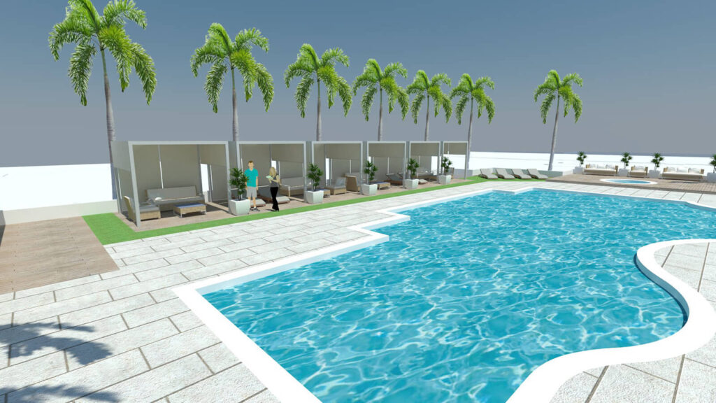 The client came to us wanting a fresh new look for their clubhouse pool area. The new design features several different zones to be enjoyed by visitors. One area offers cabanas for lounging in the shade, while other open lounge areas provide an area for those who love to sunbathe. In addition, there is a raised deck and seating around the spa.